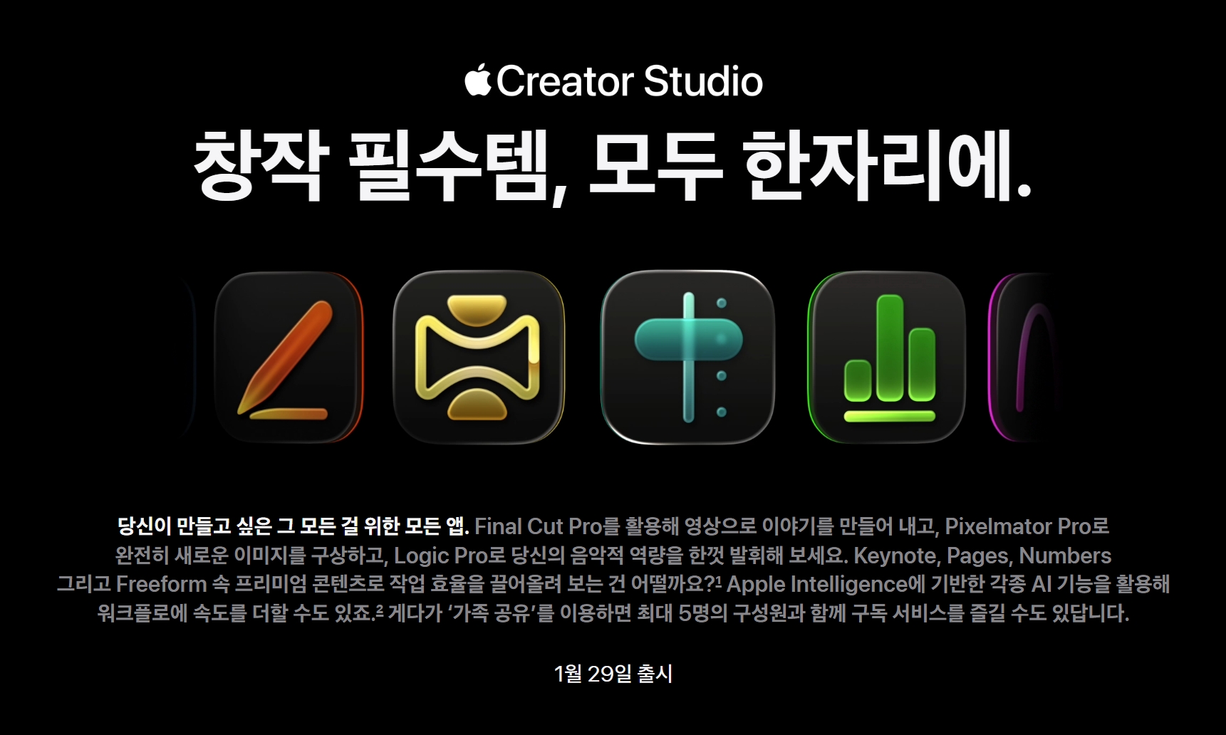 미국시간으로 1월 13일, (한국시간 1월 14일) 애플은 기존에 있던 애플 원 구독요금에 이은 새로운 구독요금 서비스를 내놓았습니다. 바로 "애플 크리에이터 스튜디오"입니다.