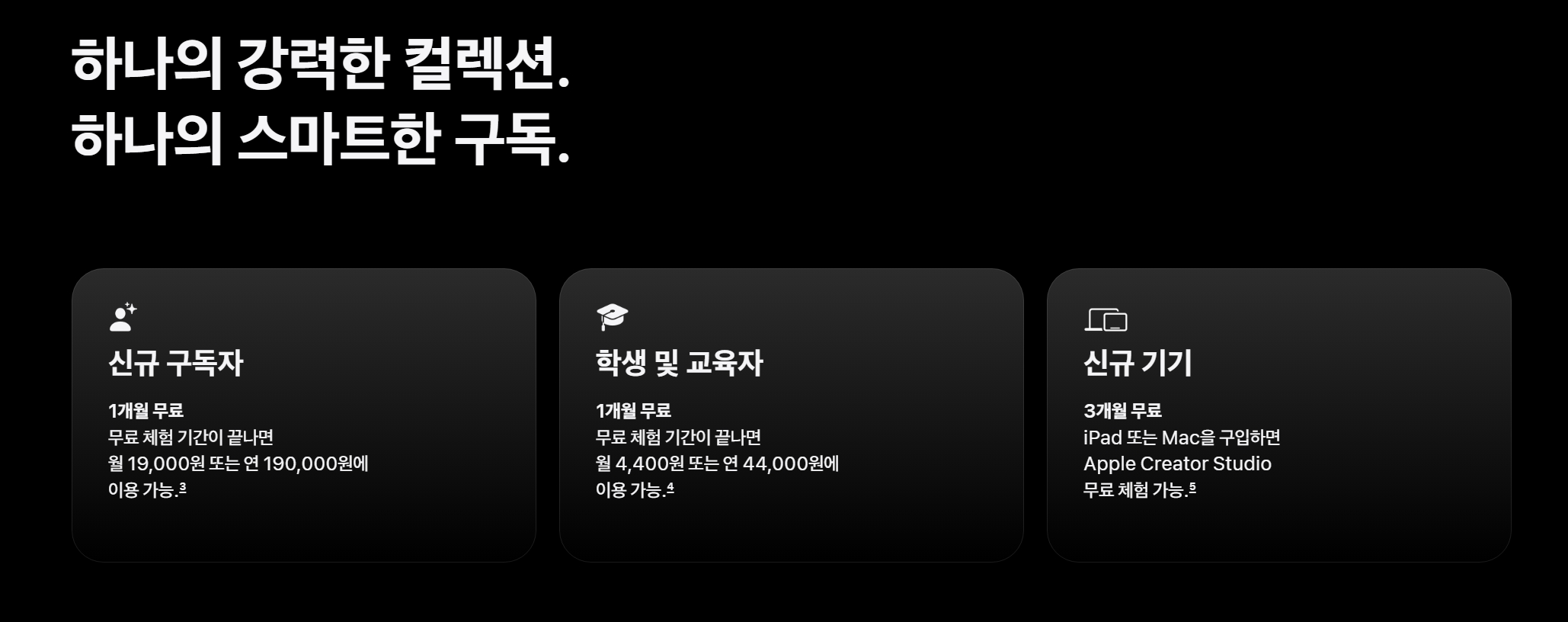 이제 중요한 거는 "가격" 이겠지요. 결론만 말하면 "현재 어도비 CC보단 쌉니다" 라고 말할 수 있을 거 같습니다. 물론 그만큼 어도비가 다소 비정상적이게 높은 구독료를 책정 중이긴 한데, 현재 개인용 기준 애플 원 구독료가 14,900원이고, 애플 크리에이터 스튜디오 요금이 개인용이 19,000원 입니다. 어도비CC 구독료가 현재 한국에서는 클래스 101과 제휴 중인 요금제를 이용해도 34,900 원 정도라 쳤을 때, 33,900원이니, 1000원이 싸다는 결론이 나옵니다. 대학생이나 대학원생, 평생교육원에 재학 중인 분들은 애플 교육할인을 받을 수 있기 때문에 (놀랍게도 이건 방송통신대학교 재학생도 적용됩니다) 그러면 애플 크리에이터 스튜디오 이용료는 월 4,400원입니다. 이쯤 되면 정말 대놓고 "어도비 저격용"이라는 말이 느낌이 확 오는데, 이쯤 되면 어도비도 결단을 안 하려야 안 할 수는 없을 거 같습니다.