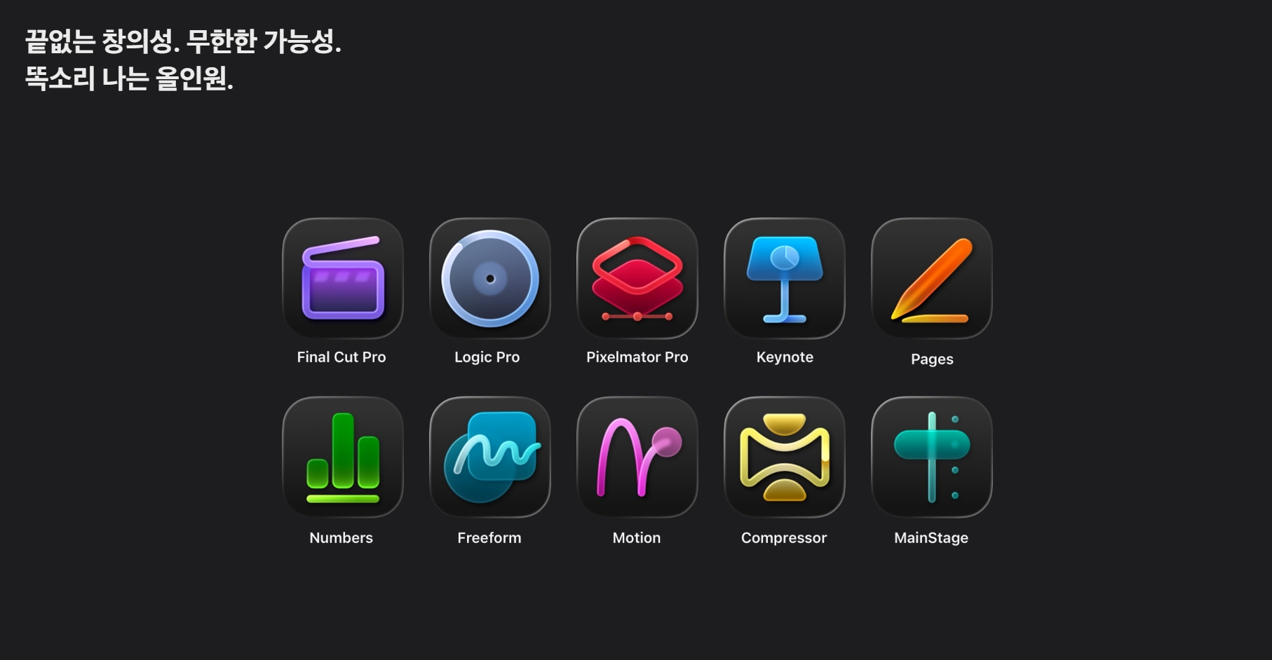 그런데 이번에 애플이 구독요금제 개편을 하면서 이제 파이널컷 따로, 로직 프로 따로 구독하던 것을 묶어서 애플 원처럼 낸 것을 생각하면 애플도 드디어 "애플 원 서비스 식으로 하는 것이 제일 낫다"라는 것을 인제야 터득한 거 같습니다. 솔직히 저는 이 요금제가 출시될 거란 루머가 들렸을 때도 "음... 그래도 로직프로-메인스테이지 따로 / 파이널컷-모션 따로 / 픽셀메이터 따로 하지 않을까?" 했는데, 아예 로직, 파이널컷, 픽셀메이터, 모션까지 묶인 상품에 기존의 iWork 가 추가된 형태가 되었습니다. 그런데... 음... 아이워크가 묶인 건 "읭?" 하실 수도 있는데요. 아이워크는 원래 "애플 기본 어플"이라서 애초에 문서 작성과 저장은 다 애플 장비를 샀다면 무료였습니다. 그런데 구독제 요금에 넣었다는 것은 뭔가가 더 있다는 건데요.