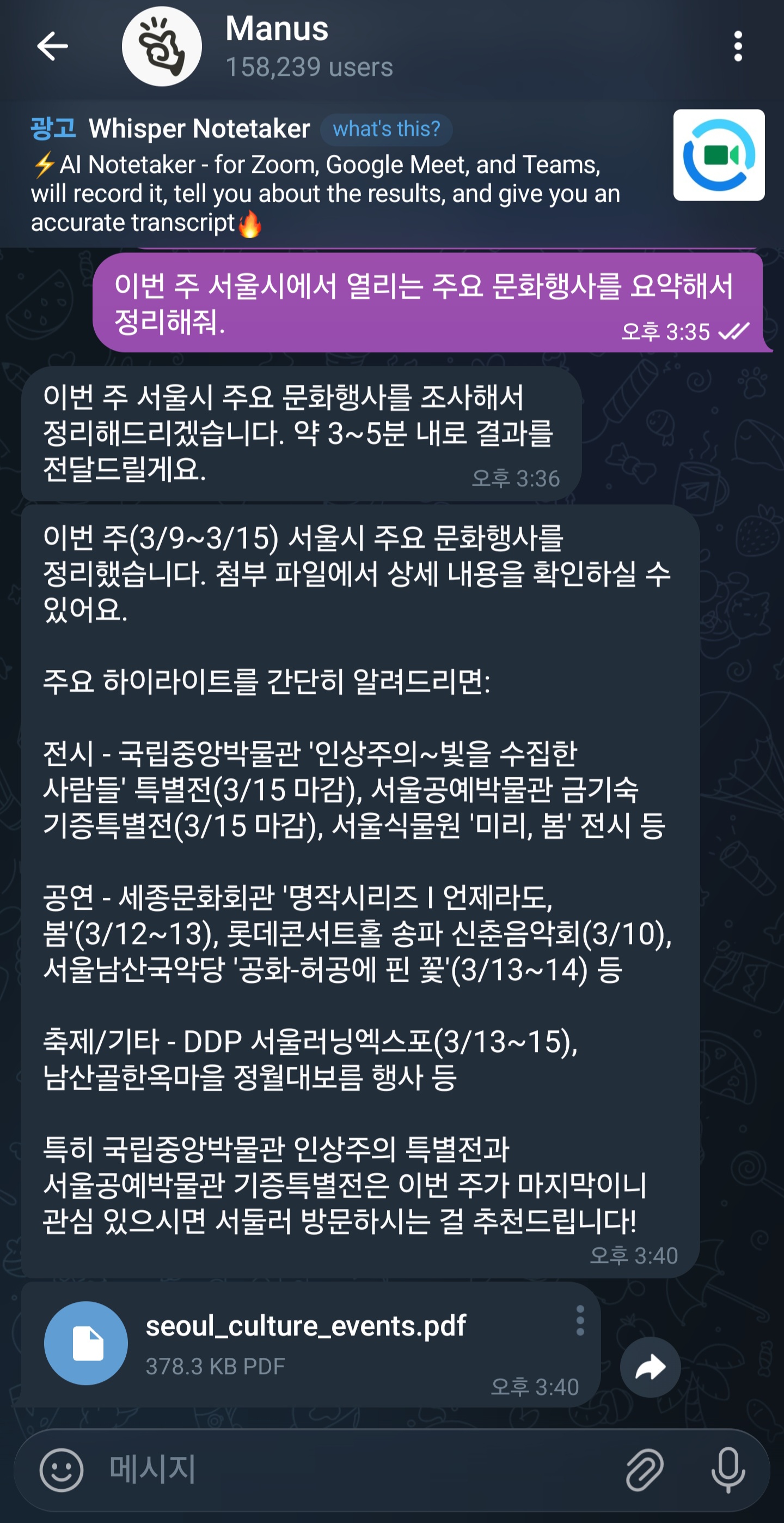 그래도, 텔레그램으로나마 테스트해본 Ai 에이전트 기능은 좀 신기하긴 했습니다. 이전에는 오픈클로 시스템으로 구축해야 텔레그램에서 Ai 에이전트를 돌릴 수 있었던 데 비해, 메타 계정과 텔레그램 연결이 가능하면 바로 에이전트 기능을 쓸 수 있는 점은 매력적이긴 했습니다. 아무래도 조만간 페이스북 메신저와 연동이 되겠지요. 페이스북 메신저의 기능이 더 강력해질 거 같습니다.