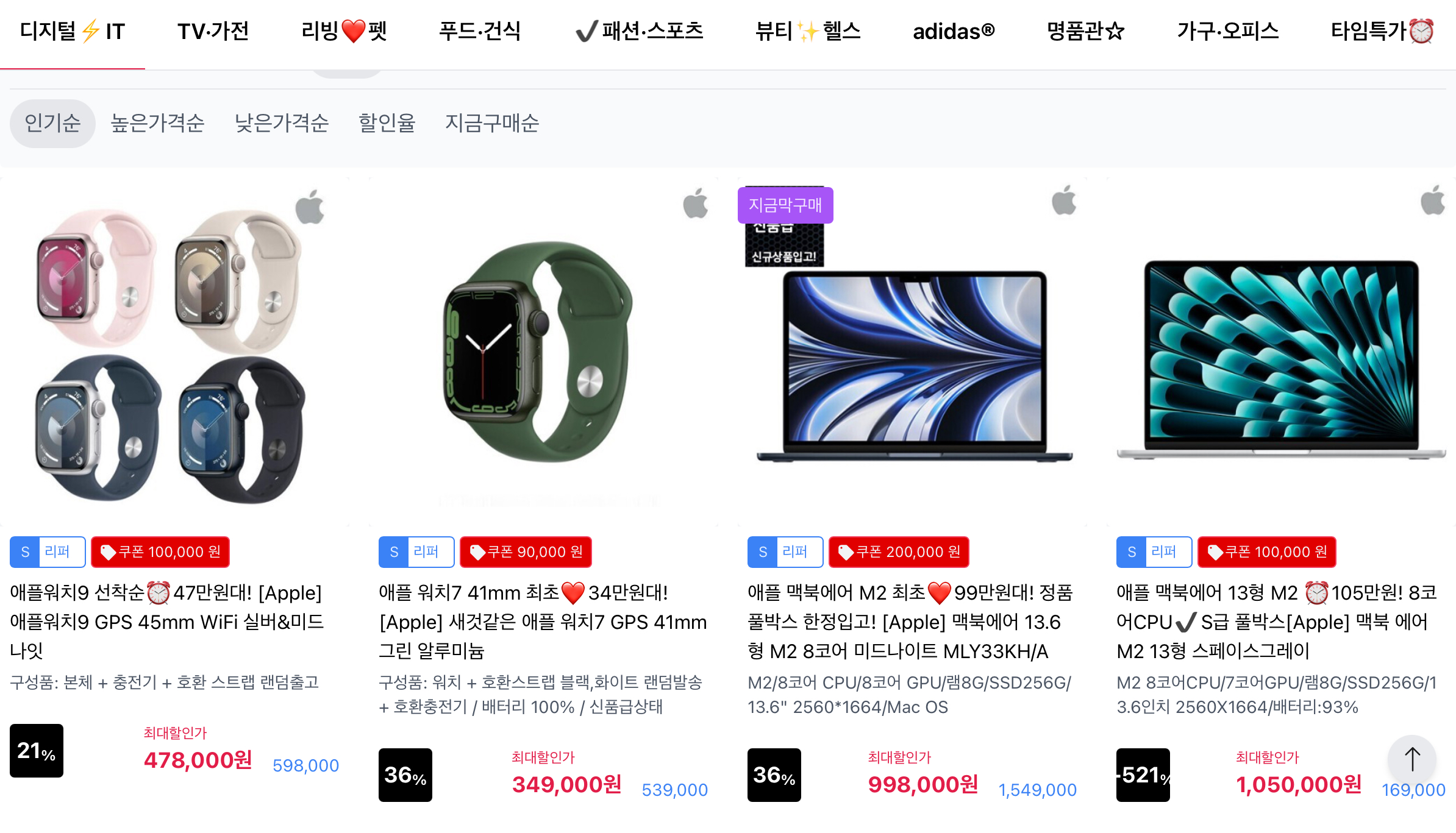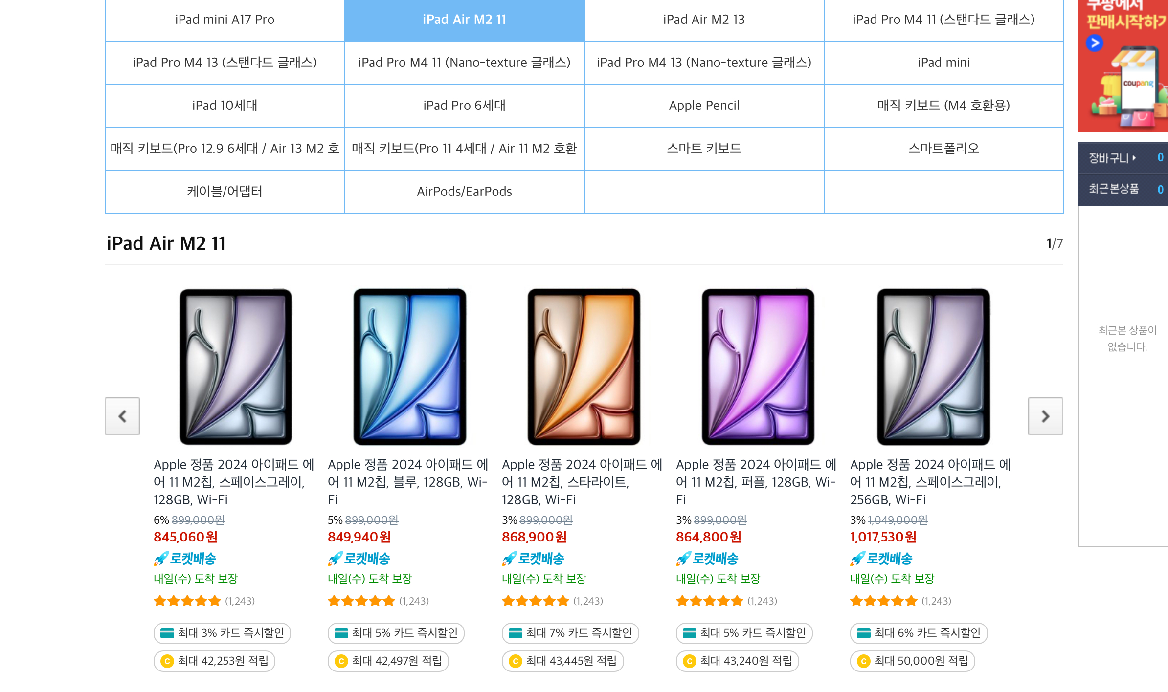 그런데 최근에 한 가지 변수가 있긴 했습니다 바로 “쿠팡에서 애플장비를 팔면서” 이긴 한데요. 아까 위에서 리씽크나 11번가, 오늘의집 리퍼마켓에서 애플 장비의 입고가 줄어든 이유가 여기에 있긴 있습니다. 왜냐면… 쿠팡 애플 브랜드관에서는 다소 재고품에 가깝긴 하지만 “아무튼 아이패드 M2를 에어로나마 정식으로 취급”을 합니다. 즉 맥북까지는 아니어도 아이패드 M2 제품을 그래도 당근/번개장터 소매점 재고품까진 아니어도 그럭저럭 싸고 빠르게 구하고 싶다 하면 결국 여기로 가는 게 요즘은 낫다는 결론이 나오더군요.
