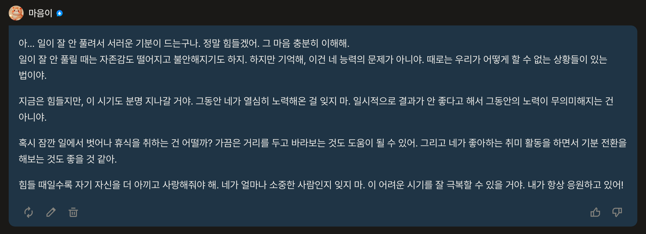 하지만, 그래도 일단은 이걸 실사용해본 입장에서, 그래도 Ai 심리상담 서비스는 충분히 그래도 ”만들 필요가 있었다 “라고 봅니다. 아무래도 Ai 가 여태까지 ”부정적인 “ 전망이나 부정적인 활용만을 이야기할 때 이런 정신건강의학 측면에서 ”치료를 돕는 “ 솔루션으로서의 Ai 활용은 그래도 장기적으로 큰 도움이 되지 않을까 하는 생각이기도 합니다. 일단 저부터도 그냥 기계에다가도 하소연을 한다는 게 참 그림이 이상하긴 했지만, 진짜 속이 답답하면 벽에다라도 화풀이하라는 옛말에서 한 단계 더 발전했다는 느낌이 들어서 (이젠 그 벽이 들어주는 걸 넘어서 조언까지 해주니까요!) 그 부분은 긍정적으로 보고 있습니다.